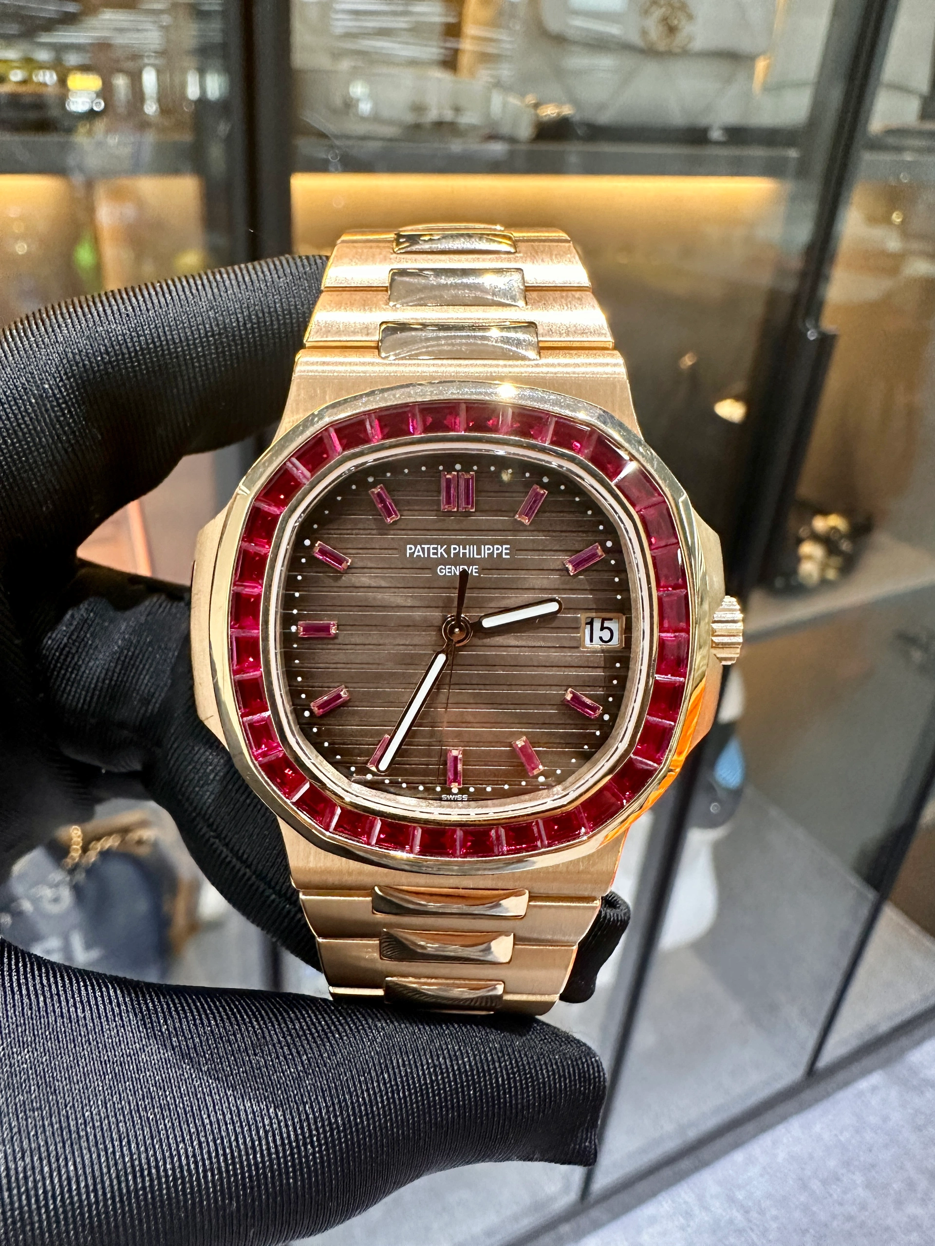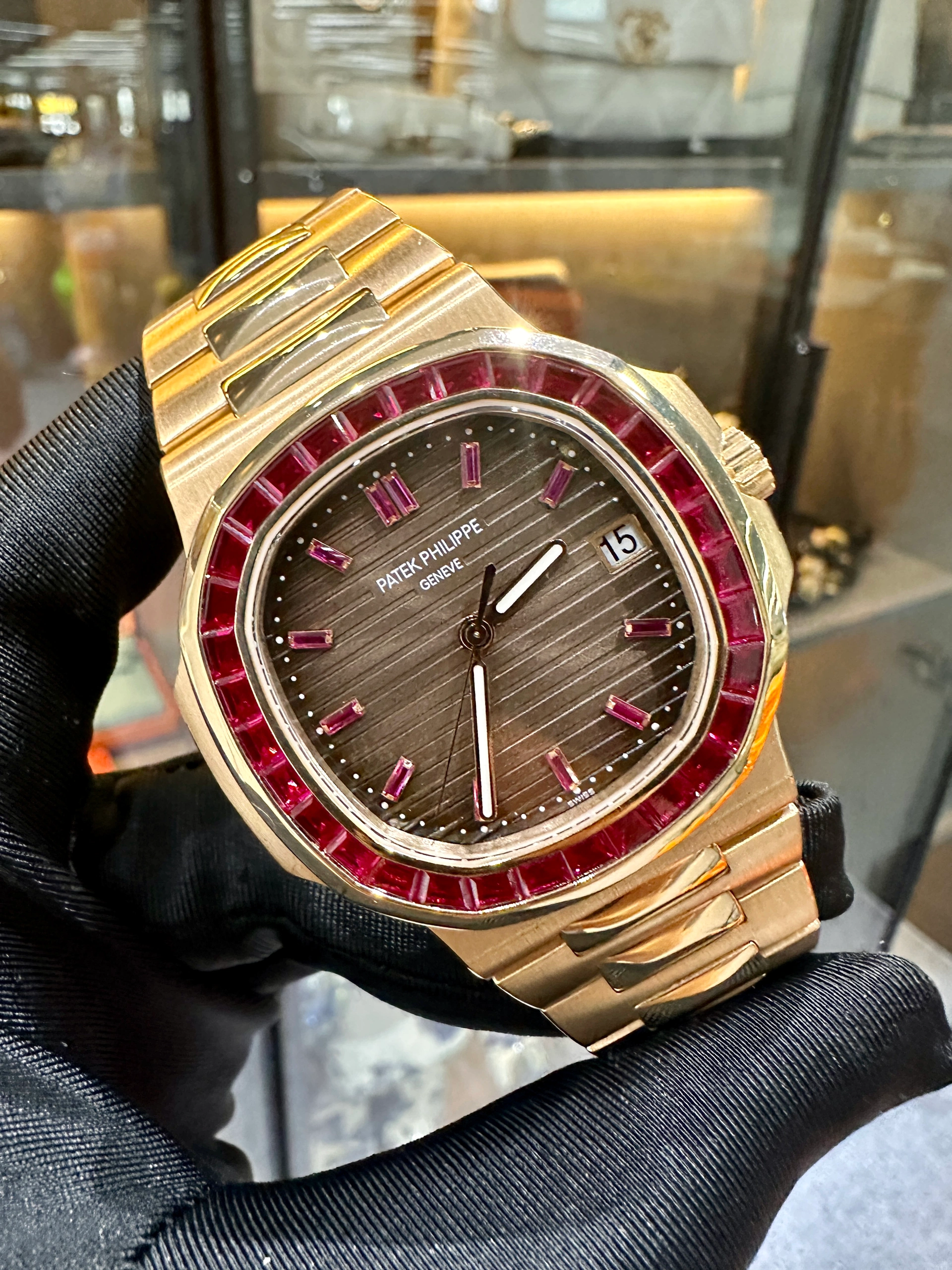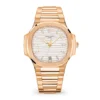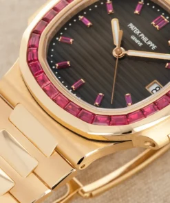 This certified authentic Brand New Patek Philippe Nautilus Watch, with the Model Number: 5723/112R-001, has a Rose Gold 40 mm Round Case with Screw Down Crown and a Gem Set. This Men’s Patek Philippe Nautilus has an attractive Dial with Gems Dial Markers.