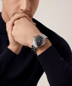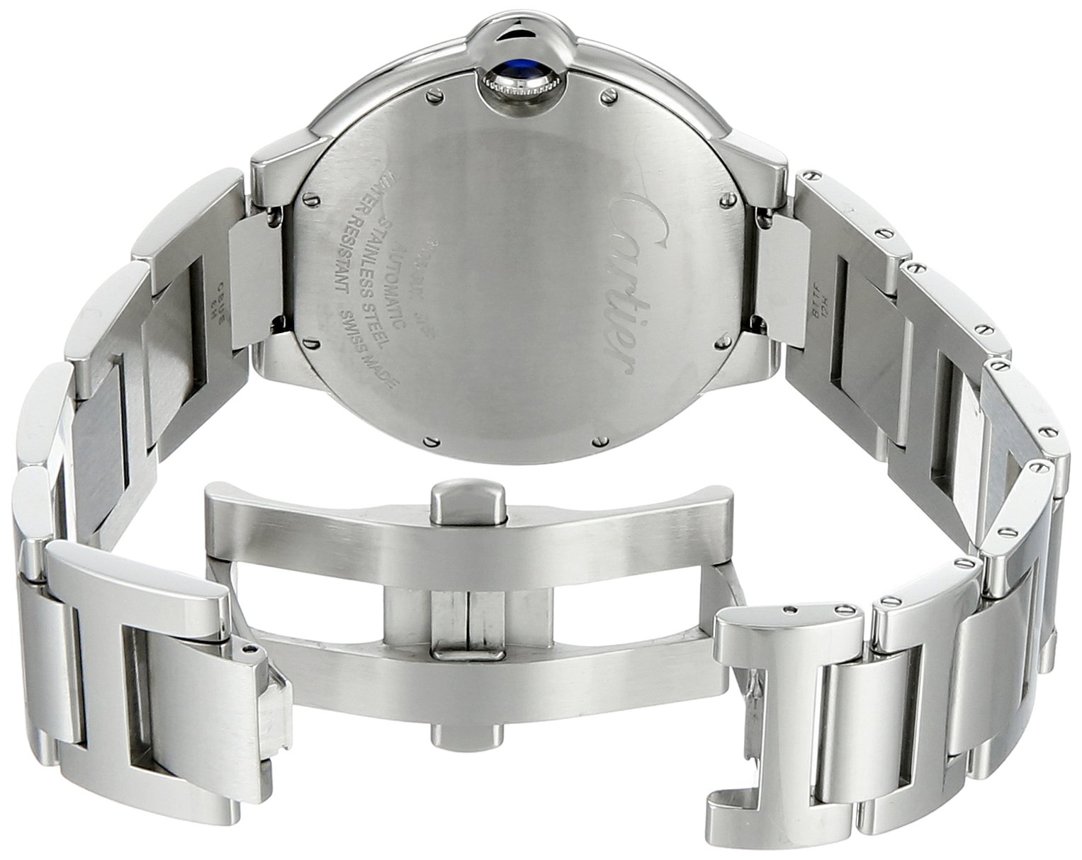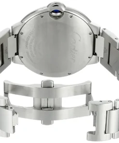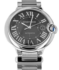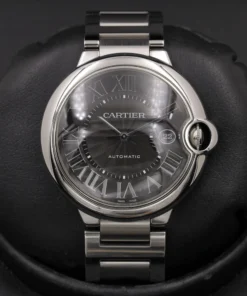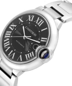 Cartier Ballon Bleu stainless steel case with black guilloché dial with Roman numerals and date at 3 o’clock. Automatic movement. Comes with a Cartier stainless steel bracelet with deployant clasp. Fits 6-1/2″ wrists