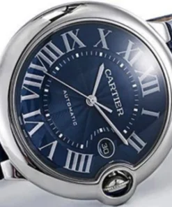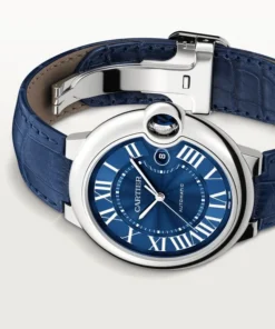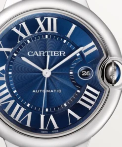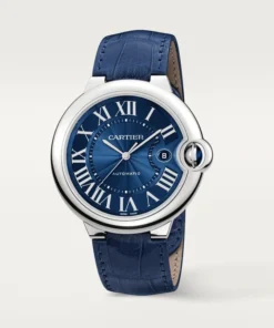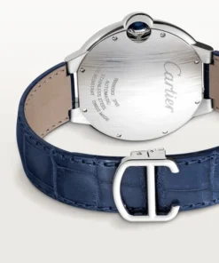 Ballon Bleu de Cartier watch, 42 mm. Mechanical movement with automatic winding, caliber 1847 MC. Steel case, fluted crown set with a cabochon synthetic spinel, blue guilloché dial. Sword-shaped hands, sapphire crystal, blue alligator leather strap, steel interchangeable deployant buckle. Calendar aperture at 3 o’clock. Thickness: 13 mm. Water-resistant up to 3 bar (approx. 30 meters/100 feet).