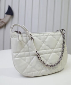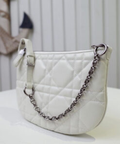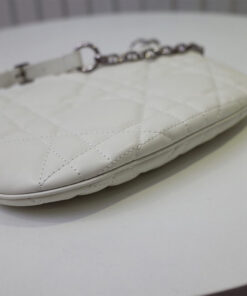 The mechanism allows the handle to be slipped into the chain’s ring to become a strap, transforming the shoulder bag into a clutch.