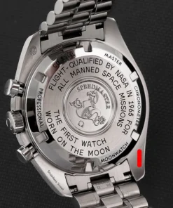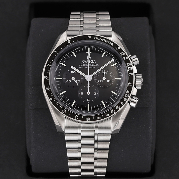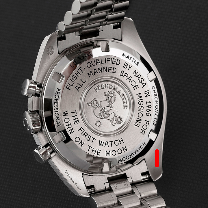 Presented on a brushed five-arched-links-per-row bracelet, this 42 mm Moonwatch in stainless steel features hesalite glass on the front and an embossed Seahorse medallion on the caseback. Inspired by the 4th generation Speedmaster style worn on the moon, it also includes an asymmetrical case, black step dial and the famous dot over 90 on the anodised aluminium bezel ring.