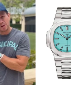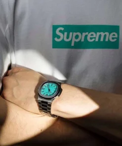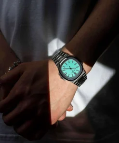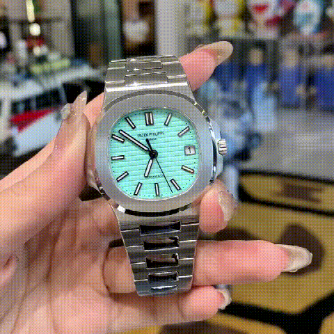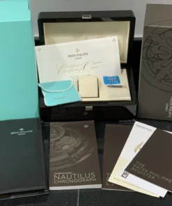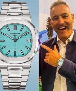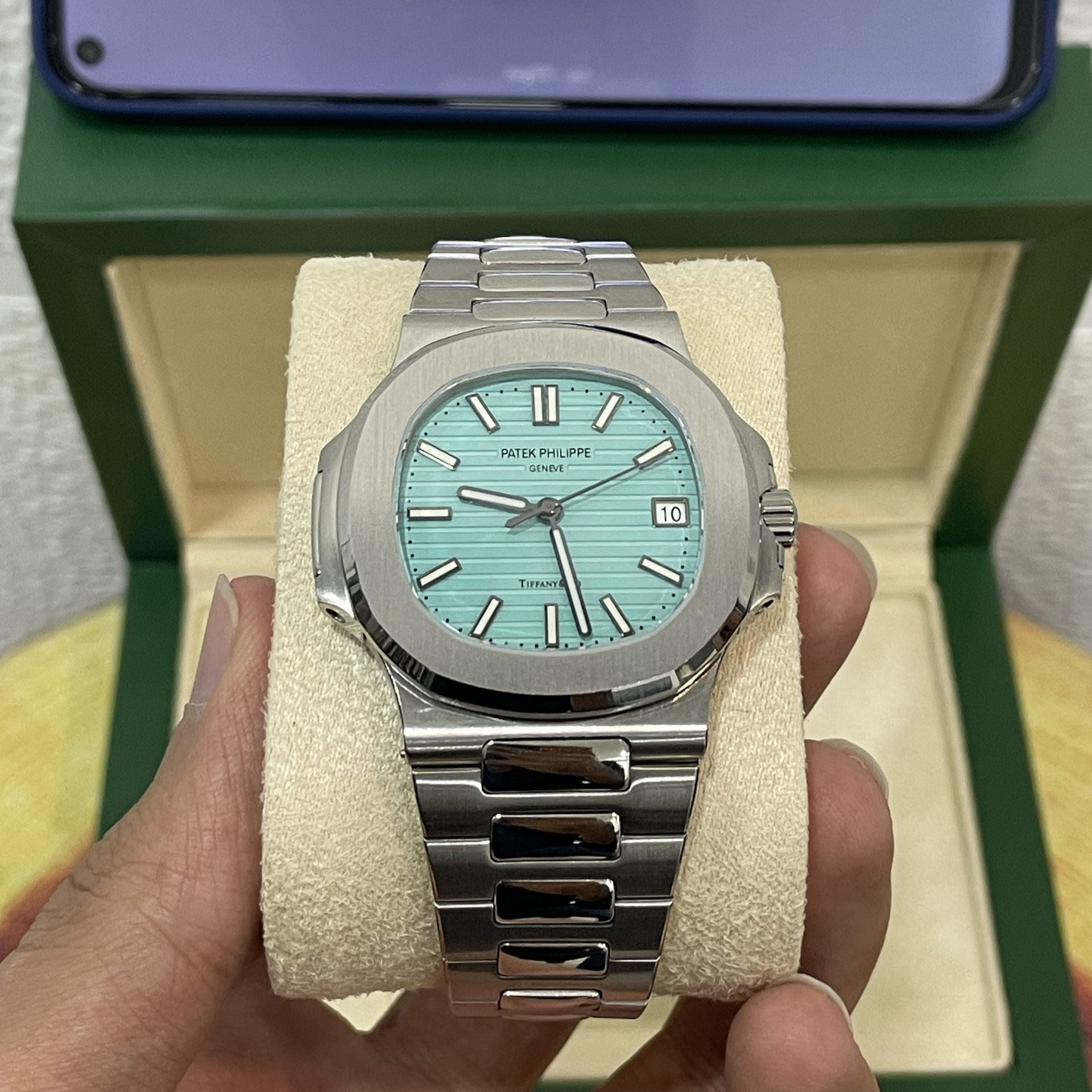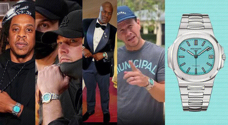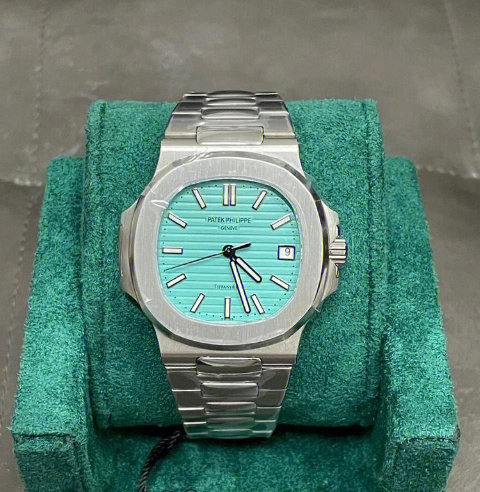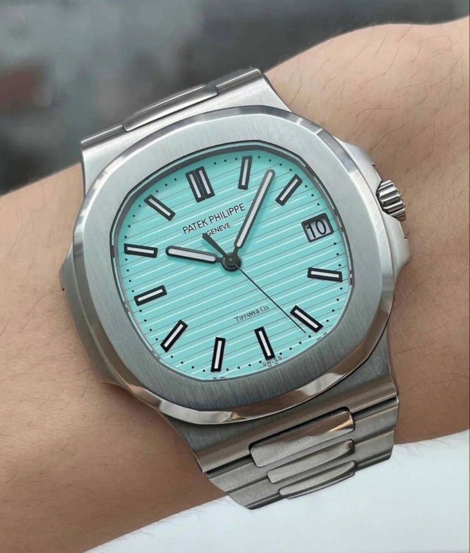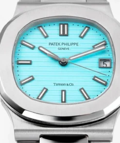 Specifications include a brass dial with Tiffany Blue® lacquer and with horizontal Nautilus embossing, black printed Patek Philippe Genève, and Tiffany & Co. signatures (hence the term double-signed Nautilus), applied hour markers in blackened 18k white gold, a touch of luminous paint and baton-style hands.
