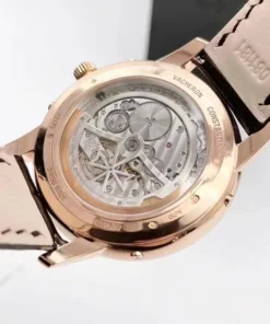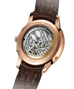 An elegant interpretation of the perpetual calendar, this 18K pink gold watch houses an ultra-slim automatic movement, just 4.05 millimeters thick, which will keep perfect time until 2100. The moon phase features a star-studded sky and two gold moons. Its openworked caseback reveals the exceptional hand-finished details of the self-winding mechanical movement.