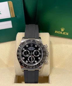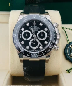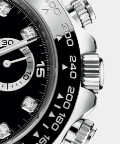 THIS OYSTER PERPETUAL COSMOGRAPH DAYTONA IN 18 CT WHITE GOLD WITH A BLACK, DIAMOND-SET DIAL AND AN OYSTERFLEX BRACELET, FEATURES A BLACK CERACHROM BEZEL WITH TACHYMETRIC SCALE.