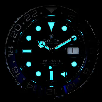 Like all Professional watches, the GMT-Master II offers exceptional legibility in all circumstances, and especially in the dark, thanks to its Chromalight display. The broad hands and hour markers in simple shapes – triangles, circles, rectangles – are filled with a luminescent material emitting a long-lasting glow.