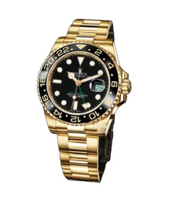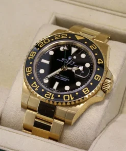 This edition of the GMT Master II displays the time on a stunning green dial via gold-trimmed Superluminova plots. A lustrous black ceramic bezel frames the dial and offers high contrast against the exceptional 18k yellow gold finish.
