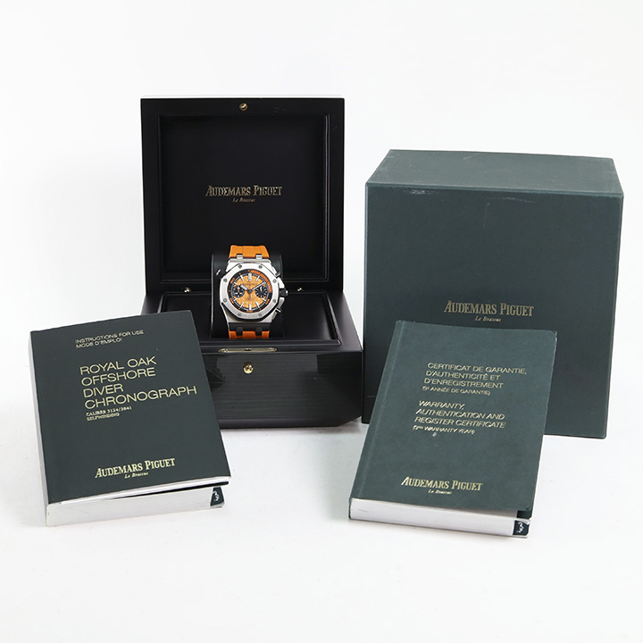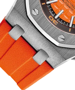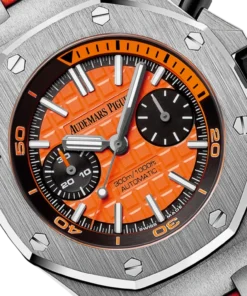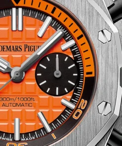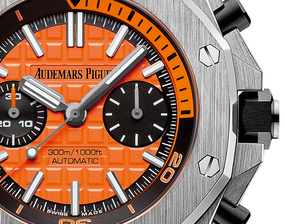 Orange dial with “Méga Tapisserie” pattern, black counters, blackened gold applied hour-markers and Royal Oak hands with luminescent coating, black rotating inner bezel with diving scale and zone from 60 to 15 minutes in orange.