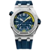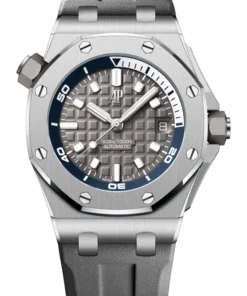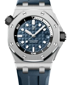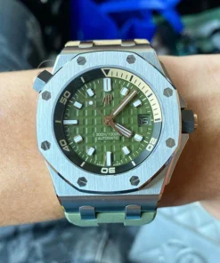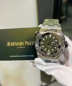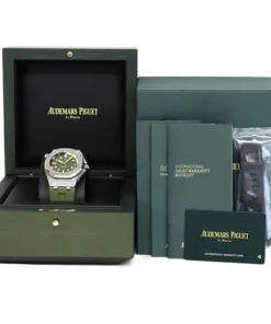 Army green dial with “Méga Tapisserie” engraved oversized check, rose gold luminescent applied hour-markers and Royal Oak hands, black rotating inner bezel with beige 0 to 15 minutes zone