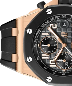 The new 42 mm Royal Oak Offshore iteration contrasts an 18-carat pink gold case with a black rubber bezel, a black Grande Tapisserie dial and a black interchangeable rubber strap for a sporty and elegant look.