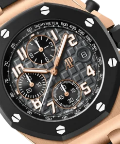 Anthracite grey dial with “Méga Tapisserie” pattern, black counters and inner bezel, arabic numeral hour-markers and pink gold Royal Oak hands with luminescent coating.