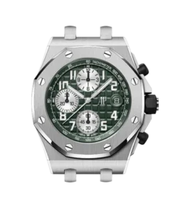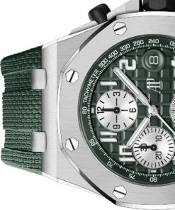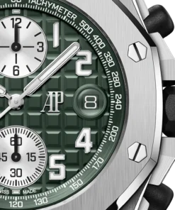 Khaki green dial with “Mega Tapisserie” pattern, silver-toned counters, arabic numerals hour-markers and white gold Royal Oak hands with luminescent coating, khaki green inner bezel.