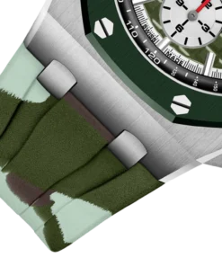 This stainless steel model features a khaki green ceramic bezel, crown and pushpieces, as well as a matching “Méga-Tapisserie” dial and camouflage rubber strap.