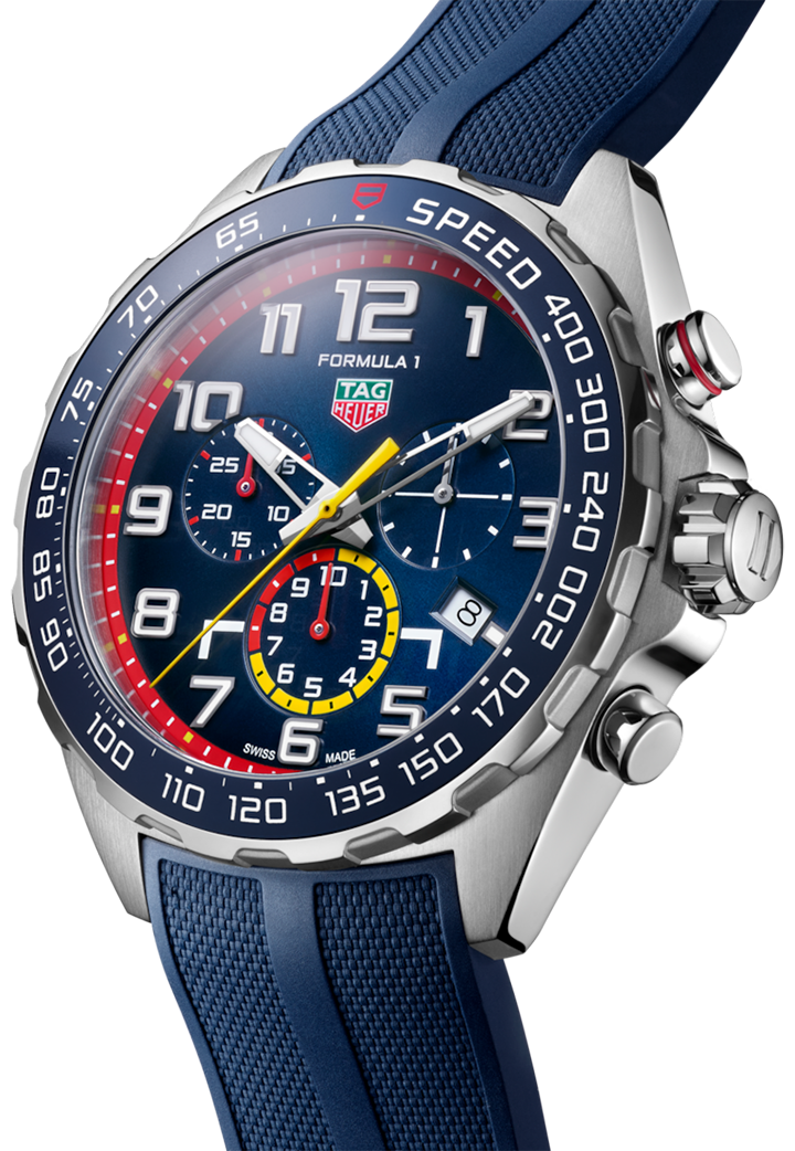 With exclusive packaging and a unique engraved caseback, this sporty chronograph celebrates the partnership between TAG Heuer and Red Bull Racing.