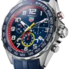 The blue sunray brushed dial with red and yellow highlights, rhodium-plated hands, and hour markers offers surpassing style in all conditions.