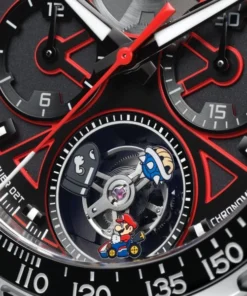TAG Mario Kart joint limited tourbillon chronograph limited to 250 pieces. The unique 45mm case is crafted from grade 5 titanium, exuding a high-performance yet sophisticated aesthetic. The crown and chronograph pushers are made of fine-grained stainless steel; the screw-in case back is also made of grade 5 titanium, with a custom sapphire glass embossed with the Mario Kart logo.
